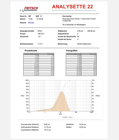 The example below for the particle size distribution of ampicillin, a semi-synthetic antibiotic from the group of beta-lactam antibiotics (penicillin), was respectively measured with a small volume dispersion unit in hexane, since the sample material dissolves in water and even other solvents. Prior to the actual measuring was an externally prepared suspension for 30 seconds pre-dispersed in an ultrasonic bath.
