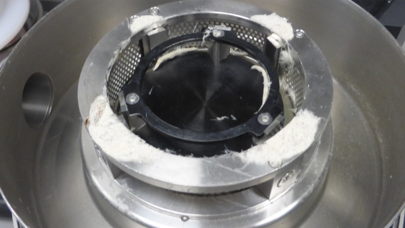The mill ran at the maximum speed of 18,000 rpm, which can be adjusted when the cutting rotor is used. The High-Performance cyclone with exhaust system was connected to the PULVERISETTE 14 premium line. Initially, the 2mm sieve was used as the sieve insert. The sample was fed in quickly, a batch of 50 grams of feathers (3-4 cm length) was processed.