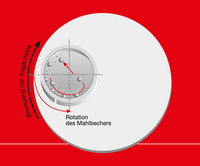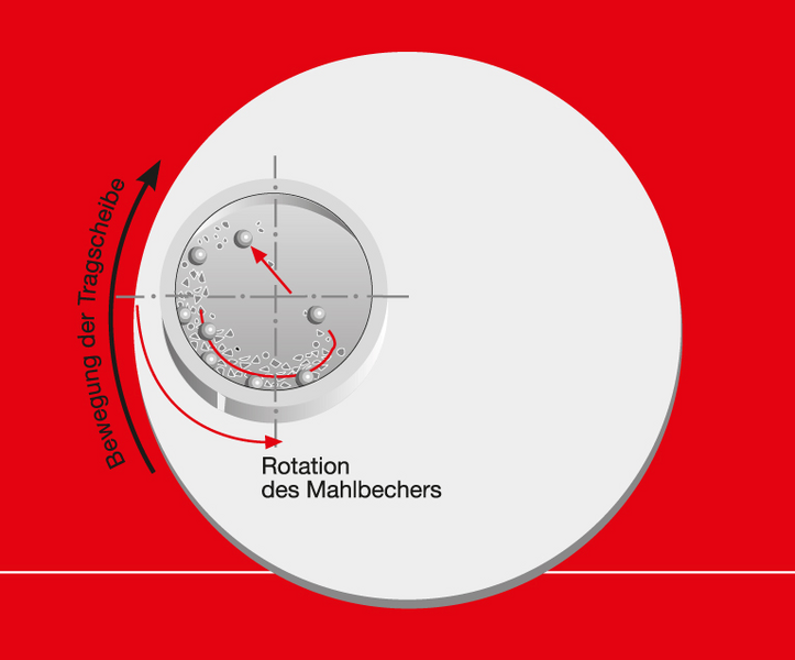 The sample is added along with the grinding balls in a grinding bowl in a planetary ball mill. The grinding bowls are fastened to a so called sun disk and turn counter clockwise around the centre of the disk. Due to impact, blow and friction effects of the grinding balls, the sample is comminuted effectively. The maximal possible rotational speed for planetary mills is limited to approximately 800 rpm. The decisive difference of the premium line to a conventional mill is the tensioning of the grinding bowls. Instead of fastening them to the sun disk, here the grinding bowls are lowered into the disk (SelfLOCK technology). This now allows a maximum rotational speed inside of the premium line of 1100 rpm and therefore an increase of the kinetic energy of the grinding medium by 150%. The grinding duration into the nano range is drastically reduced respectively makes the comminution of nano particles for certain materials actually possible. [4]