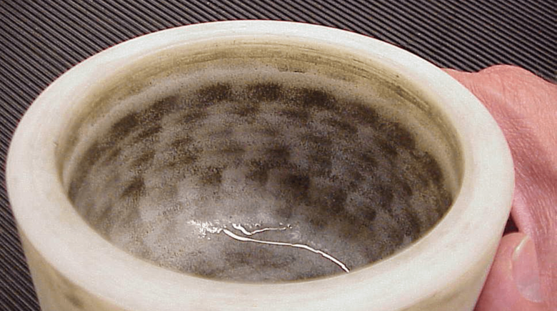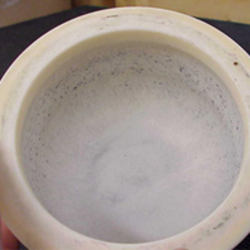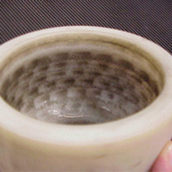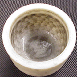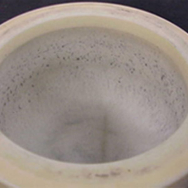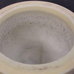 This upper, slightly stained grinding path is also clearly recognizable in the sintered corundum grinding bowl. The upper grinding path is smooth and round in every grinding bowl, whereas the grinding paths below (depending on the material of the grinding bowls) may look differently. Depending on the grinding ball size, the paths are created at different distances to one another, for example with 10 mm grinding balls, 7-8 grinding paths are attained on average, with 20 mm grinding balls 3-4 grinding paths and with 30 mm grinding balls 2 paths.