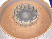 The request was to grind the nibs down to a preferably fine pourable powder. The two first mentioned mills can be eliminated based on the desired final product. Therefore the Variable Speed Rotor Mill PULVERISETTE 14 was chosen for this task. 100 g nibs were comminuted in less than a minute. Utilized was a 2 mm sieve. A glance into the open grinding chamber shows, that there is still enough room for additional material.