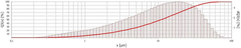 For the X-ray powder diffraction again a smaller sub set is comminuted with the Variable Speed Rotor Mill PULVERISETTE 14 using a 0.08 mm sieve. A loose and a very pourable powder is obtained which can be immediately placed on the sample carrier of the measuring instrument. The sample obtained in this manner, very well fulfils the recommendations in order to be measured with the X-ray Powder Diffractometer D2 PHASER. For the measurement the particle size is a decisive factor. Known from experience a particle size below 63 µm is to be assumed. In order to evaluate the quality of the processing steps, the particle size distribution was determined with the Laser Particle Sizer ANALYSETTE 22. In general, with the comminution of Variable Speed Rotor Mill, a distribution curve of 50 to 60 % smaller than half of mesh width of the sieve is expected. With very brittle materials, a clearly higher fineness is attained. Here for example: